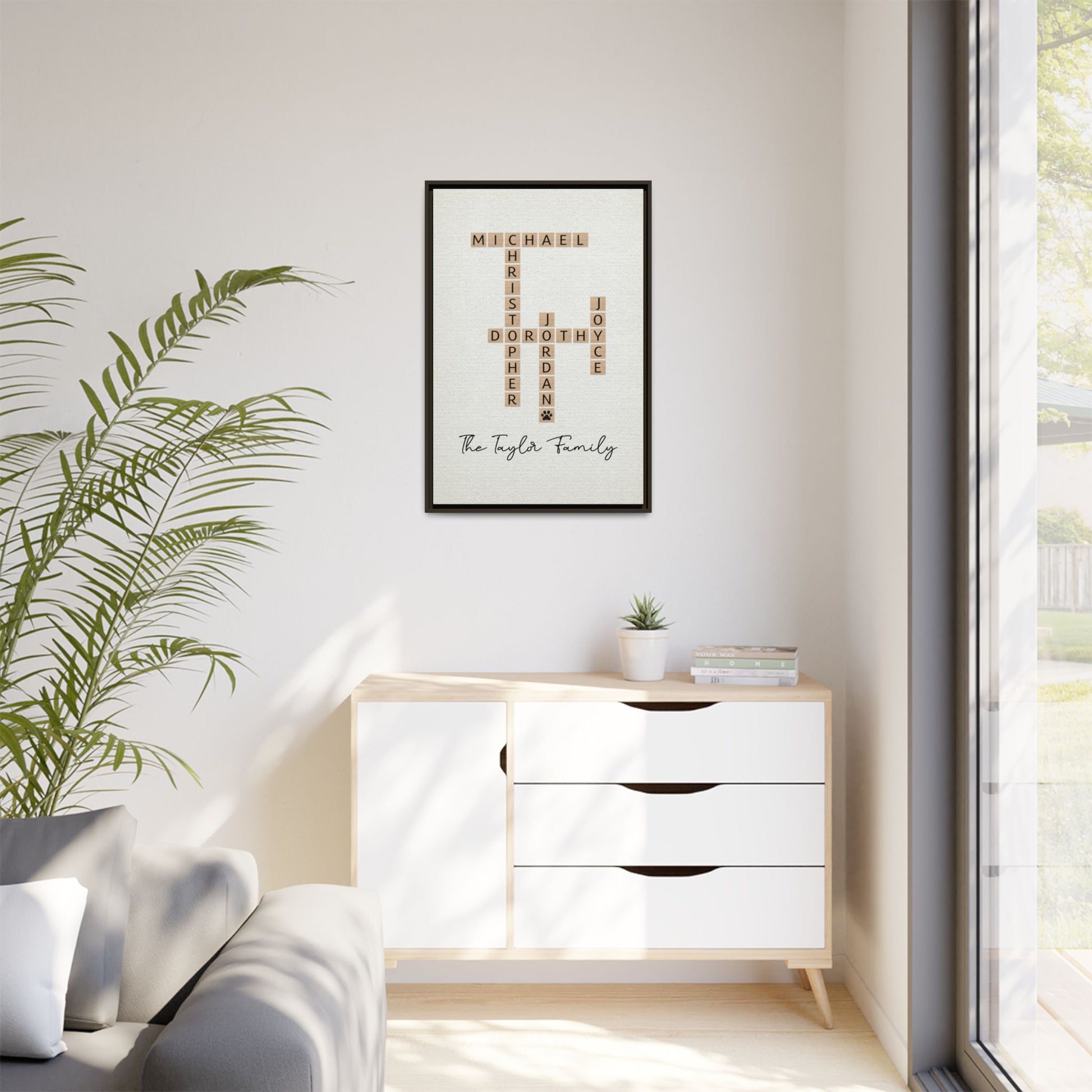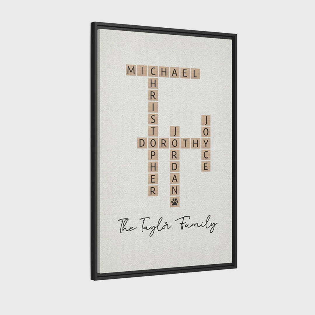 Designed like a classic Scrabble puzzle, each letter tile is thoughtfully arranged to spell out your family’s last name, creating a one-of-a-kind art piece that’s as meaningful as it is beautiful.